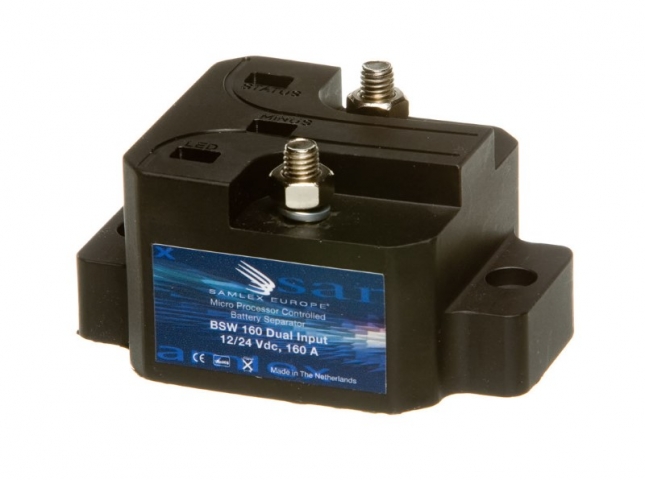 O BSW 160 DUAL foi projetado para uso em situações em que duas baterias são usadas; por exemplo em barcos, campistas e caravanas. O separador de bateria é um relé resistente controlado por microprocessador que conecta automaticamente as baterias em paralelo, quando um deles atinge a tensão atual por pelo menos 5 segundos (13,2V / 26,4V) (indicando que a bateria está sendo carregada) e desconecta quando a tensão cai abaixo do nível da aveia por pelo menos 5 segundos (12,8V / 25,6V) (indicando que uma ou mais baterias estão sendo descarregadas). O separador de bateria é uma excelente alternativa para um isolador de bateria. A principal característica é que praticamente não há perda de tensão, portanto a tensão de saída dos alternadores ou carregadores de bateria não precisa ser aumentada. Outra vantagem é que o separador de bateria pode ser montado sem alterar o circuito existente.