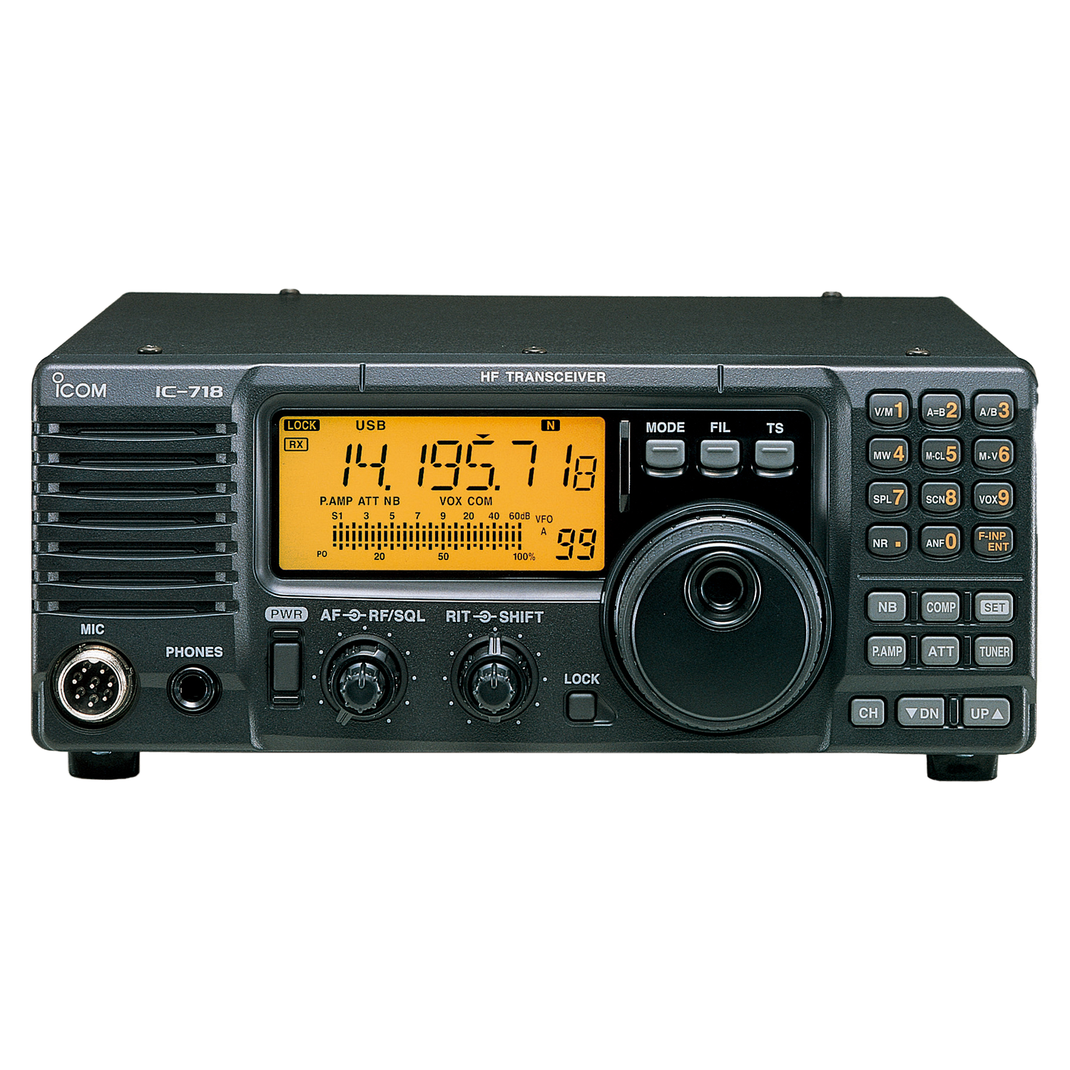 O IC-718 tem o altifalante montado sobre o painel frontal. Com o altifalante de frente para o operador, o áudio será ouvido de forma clara e direta durante a operação.