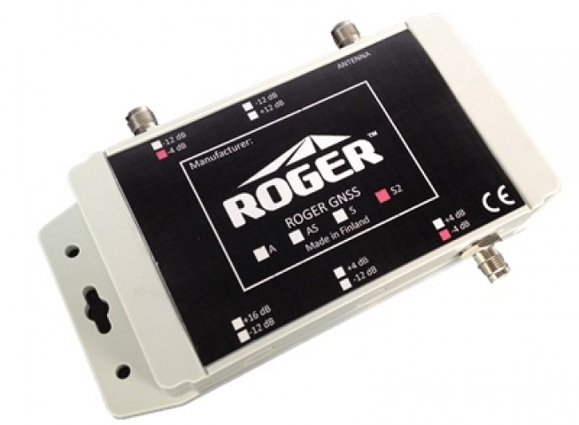 Roger GPS Splitter é um repartidor de sinal que é utilizado para distribuir sinais GNSS para dois repetidores ou para outros equipamentos ROGER.